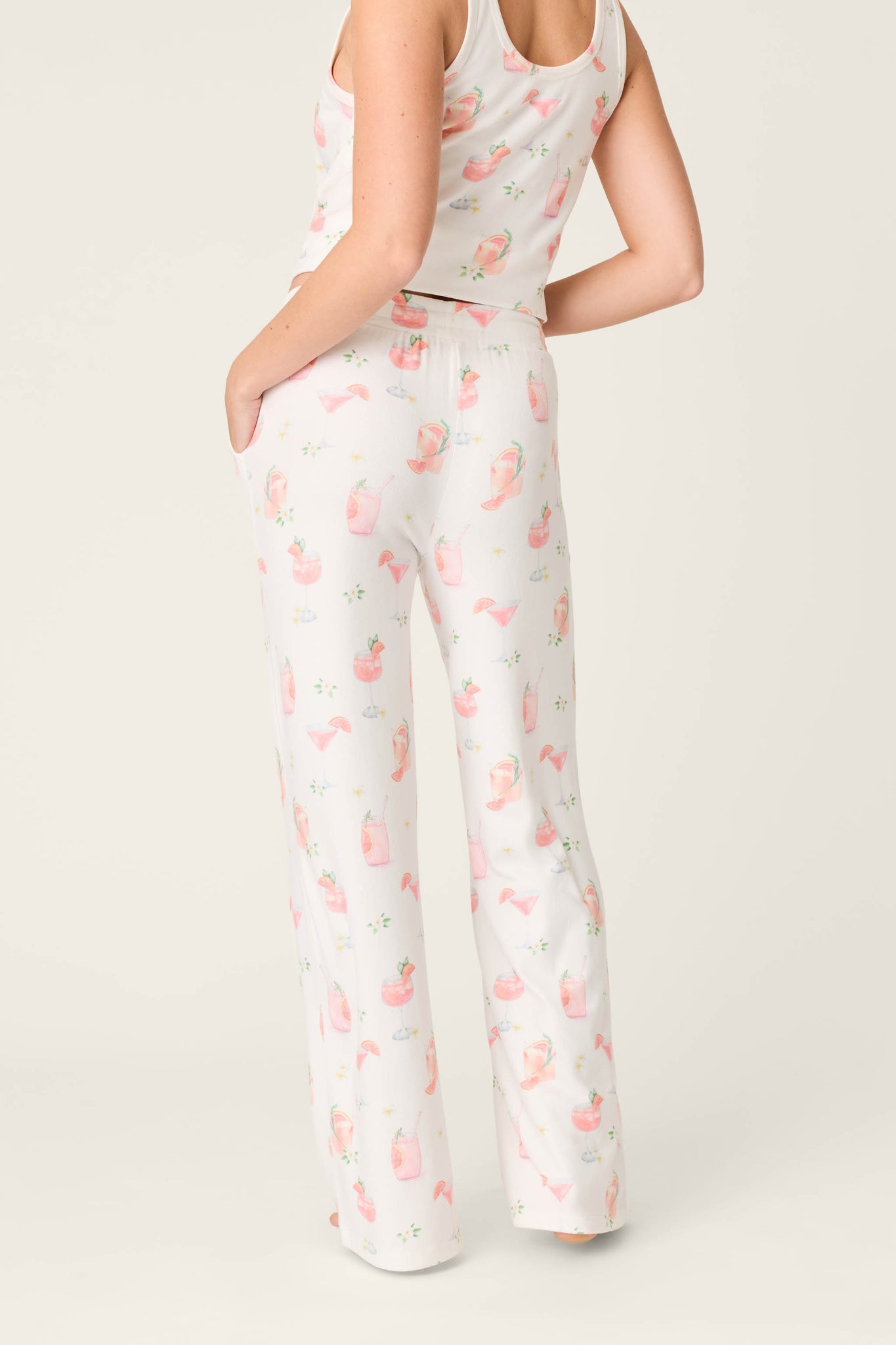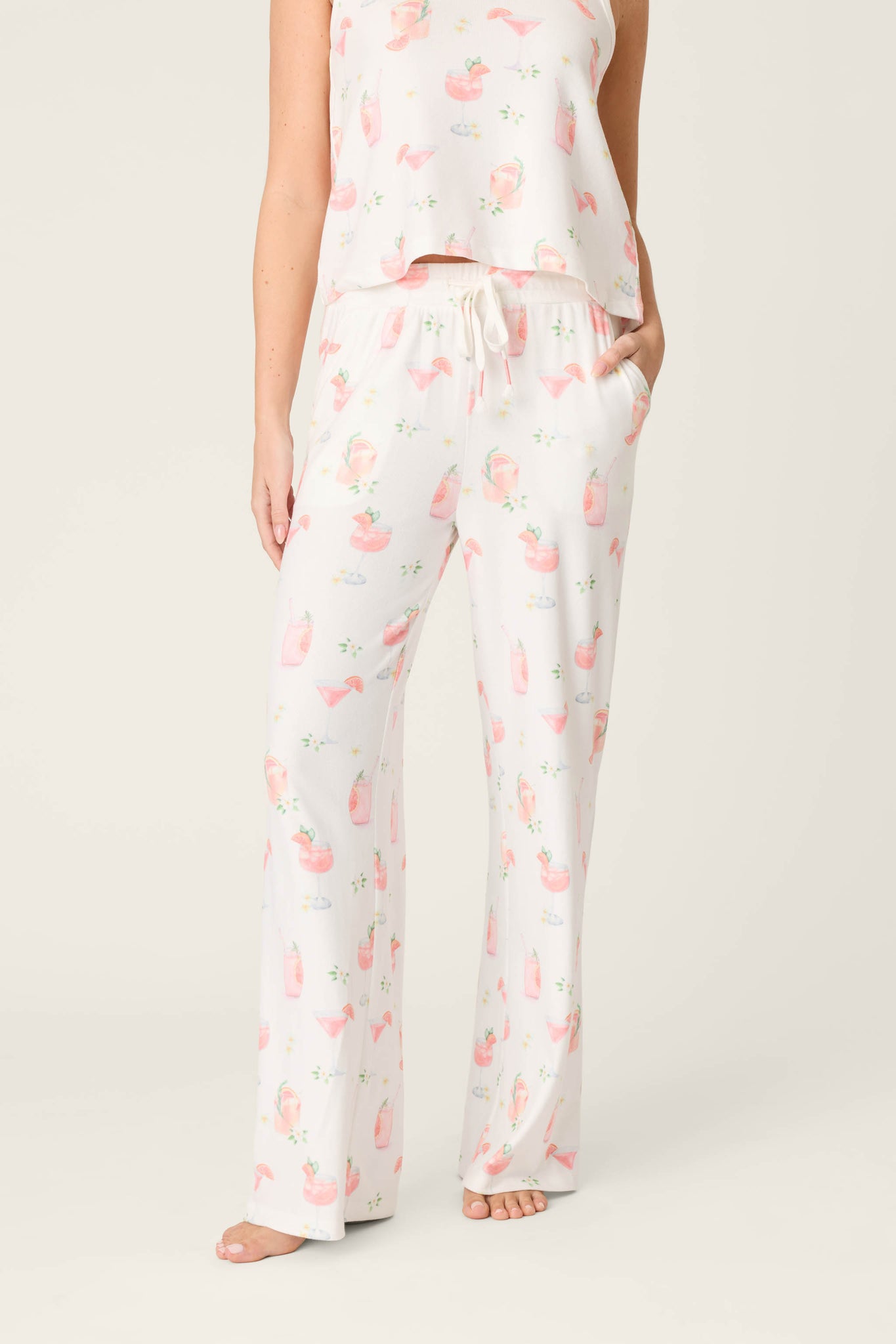 Laid‑back with a splash of fun. These ivory pants are crafted in mid butter jersey for a smooth, softly draped feel with comfortable stretch. The open‑leg silhouette flows easily, while the playful Paloma cocktail print adds a lighthearted touch. Finished with an elastic waistband, adjustable drawstring, and side pockets for everyday ease.